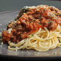 Carne à bolonhesa [rabadilha de bovino, polpa de tomate, tomate em cubos, vinho branco (sulfitos), cebola, bacon (soja e lactose), chouriço de carne (soja), azeite, sal, alho, manjericão, orégãos, pimenta preta e louro], massa spaghetti (glúten) e sal.