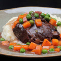 Bochecha de novilho, vinho (contém sulfitos), cebola, cenoura, alho francês, aipo, alho, colorau, pimenta, sal e louro.