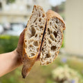 Pão de longa fermentação natural, com crosta dourada e miolo macio.
